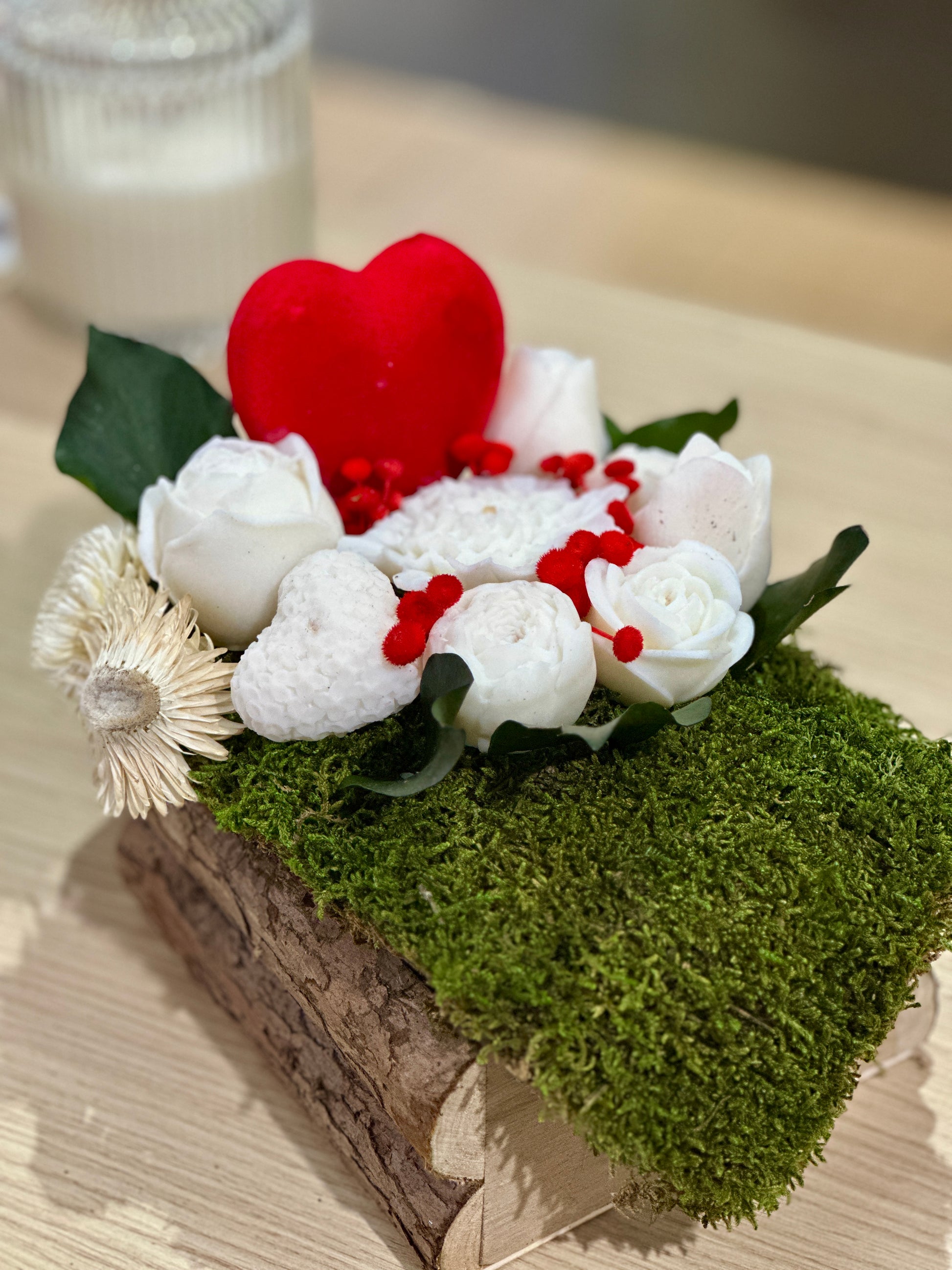 Apportez une touche de nature et de douceur à votre intérieur avec cette bûche décorative et parfumée. Sur un support en bois, la mousse déshydratée accueille des fondants parfumés délicatement plantés, accompagnés d’un joli cœur et de fleurs décoratives, pour une composition à la fois raffinée et rustique. 🌹