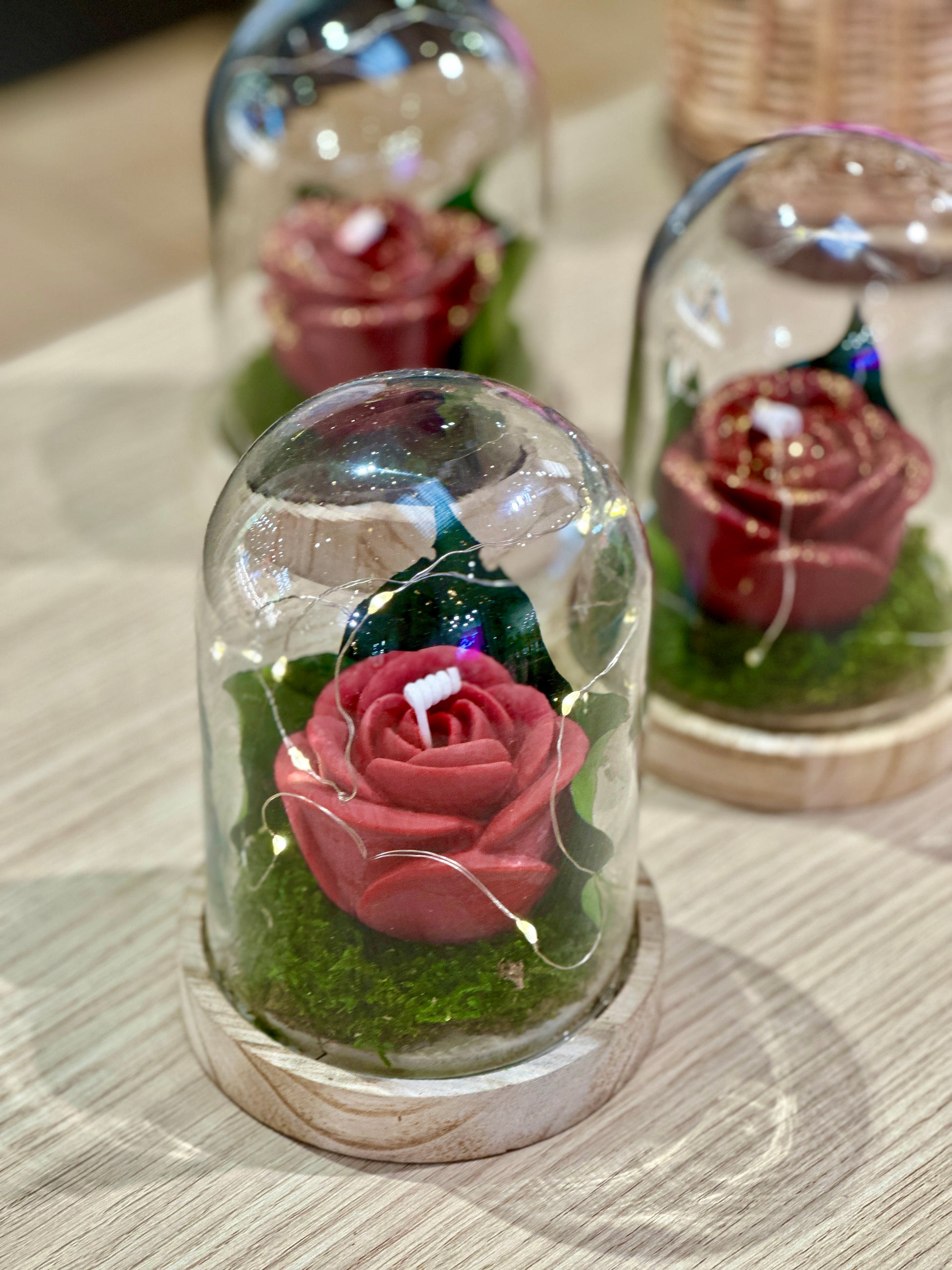 Plongez dans la magie avec cette cloche inspirée de La Belle et la Bête, une création où chaque détail a été pensé pour émerveiller. À l’intérieur, une rose rouge en bougie repose sur un délicat socle de mousse déshydratée, entourée de feuilles décoratives, et illuminée par une douce lumière LED qui fait scintiller la composition.🌹