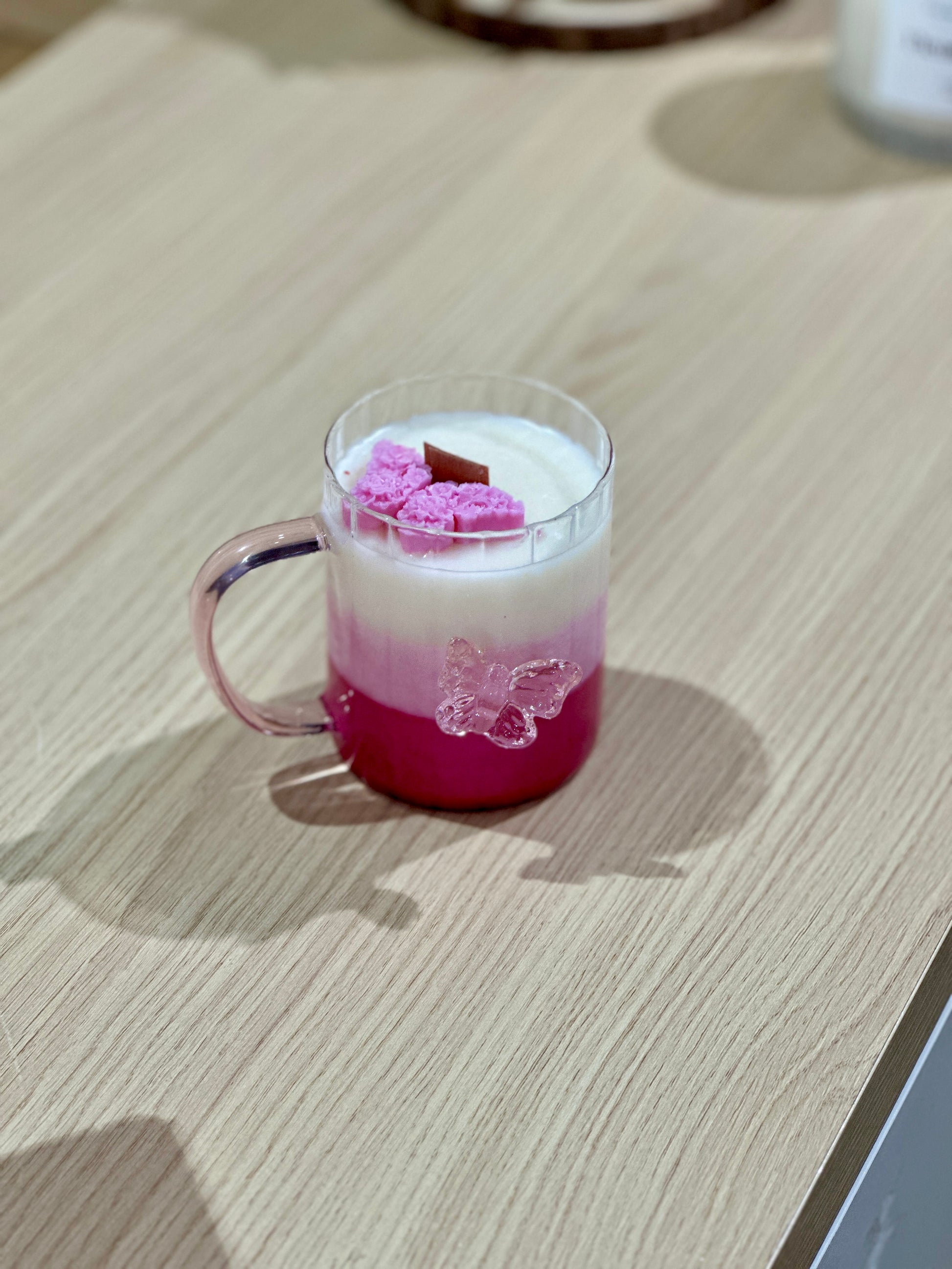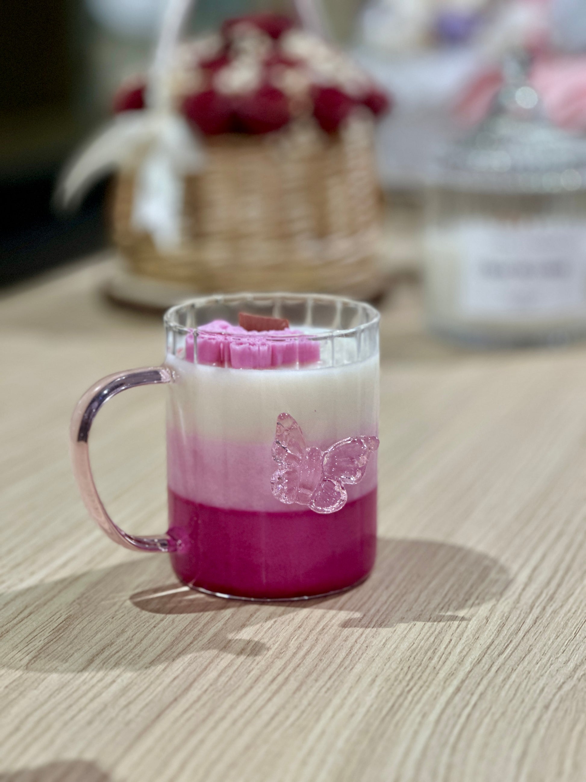 Dans un joli verre, un dégradé de rose foncé, rose clair et blanc apporte une touche de douceur et de féminité à votre intérieur. Un petit papillon est délicatement posé sur le dessus de la bougie, faisant rappel au détail du verre.🦋