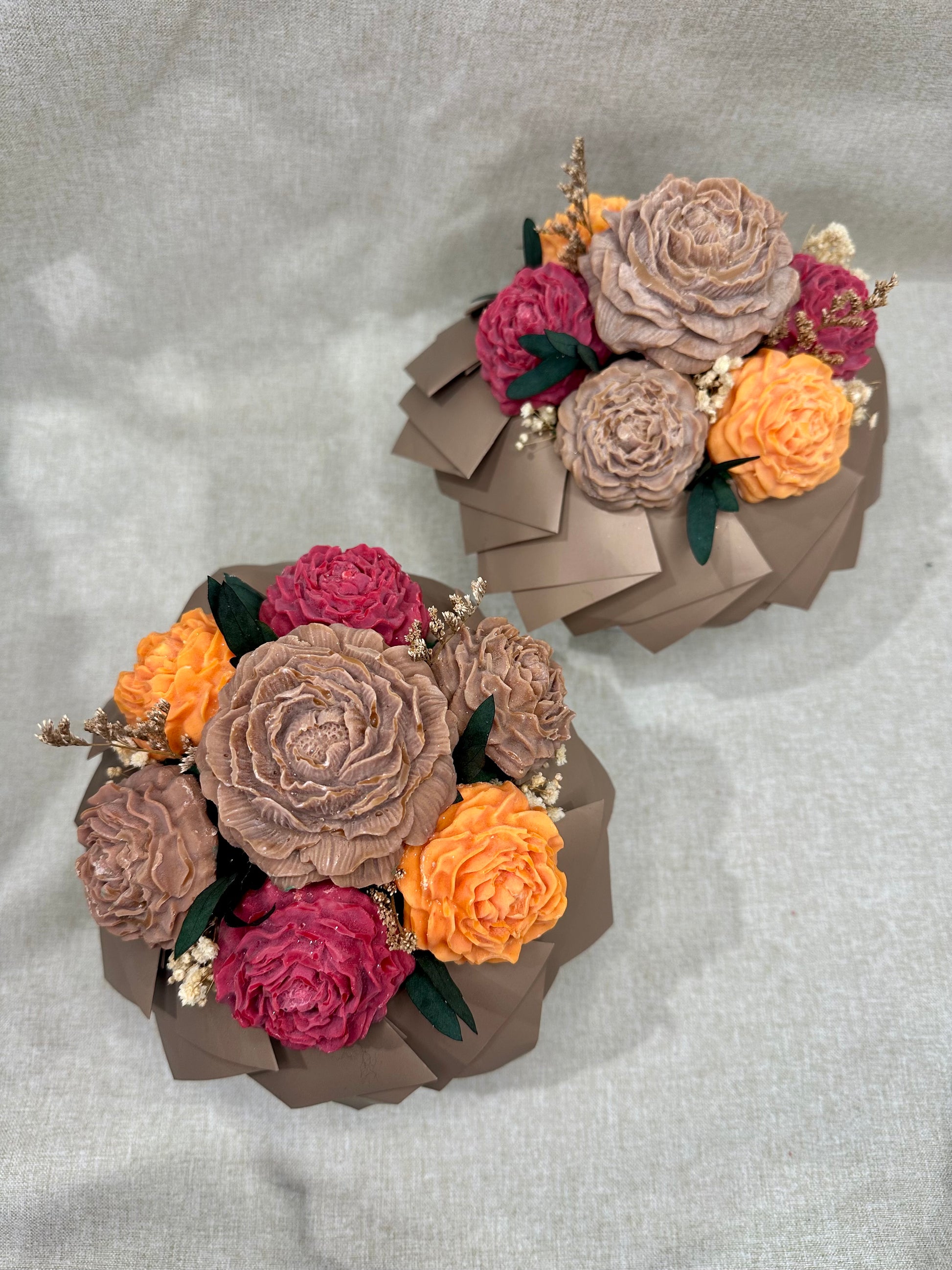 ✨ Cette composition florale réunit des pivoines, minutieusement façonnées en cire végétale et enrichies d’une fragrance de Grasse.