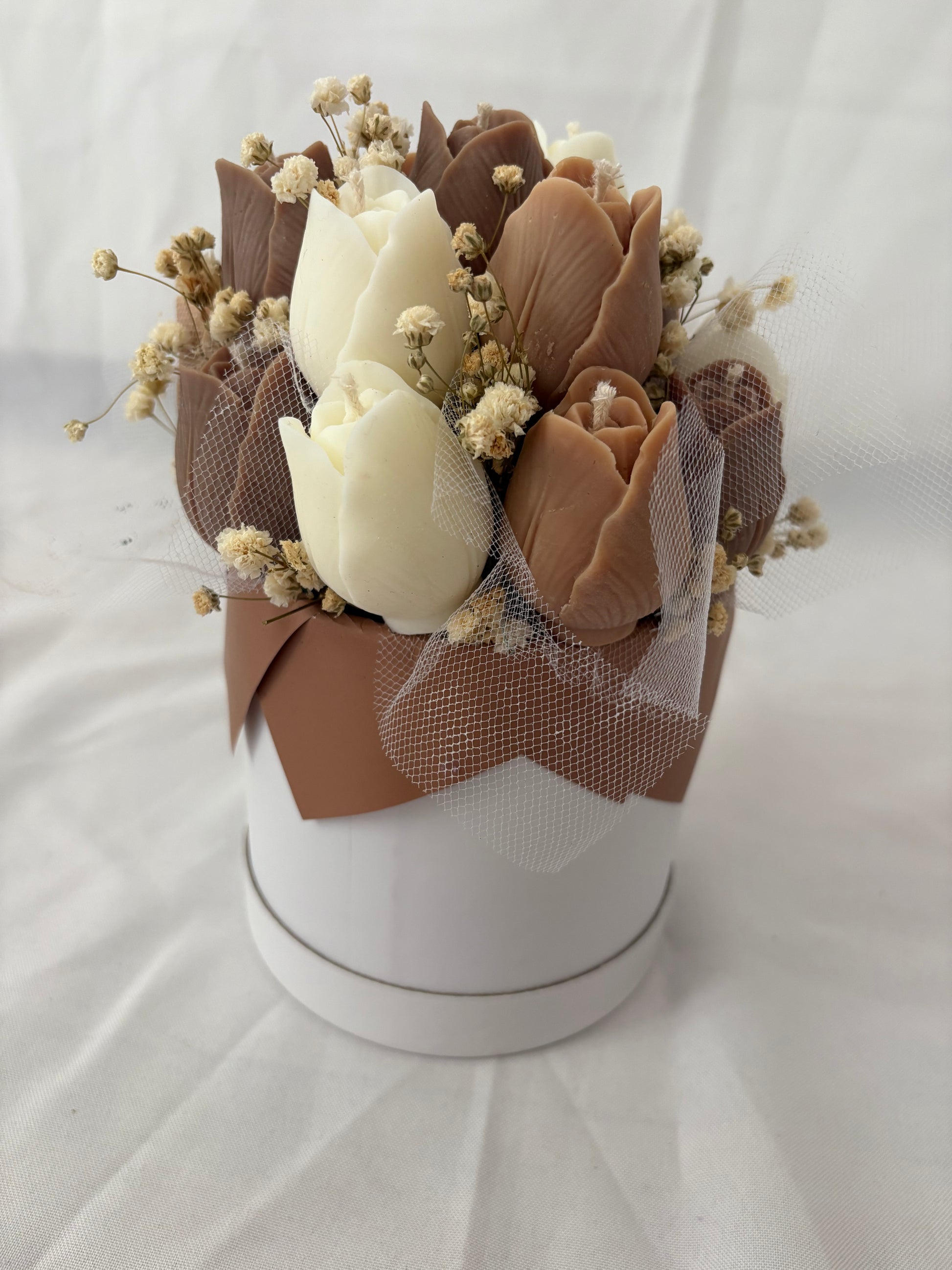 ✨ Cette composition florale réunit des tulipes, minutieusement façonnées en cire végétale et enrichies d’une fragrance de Grasse.
