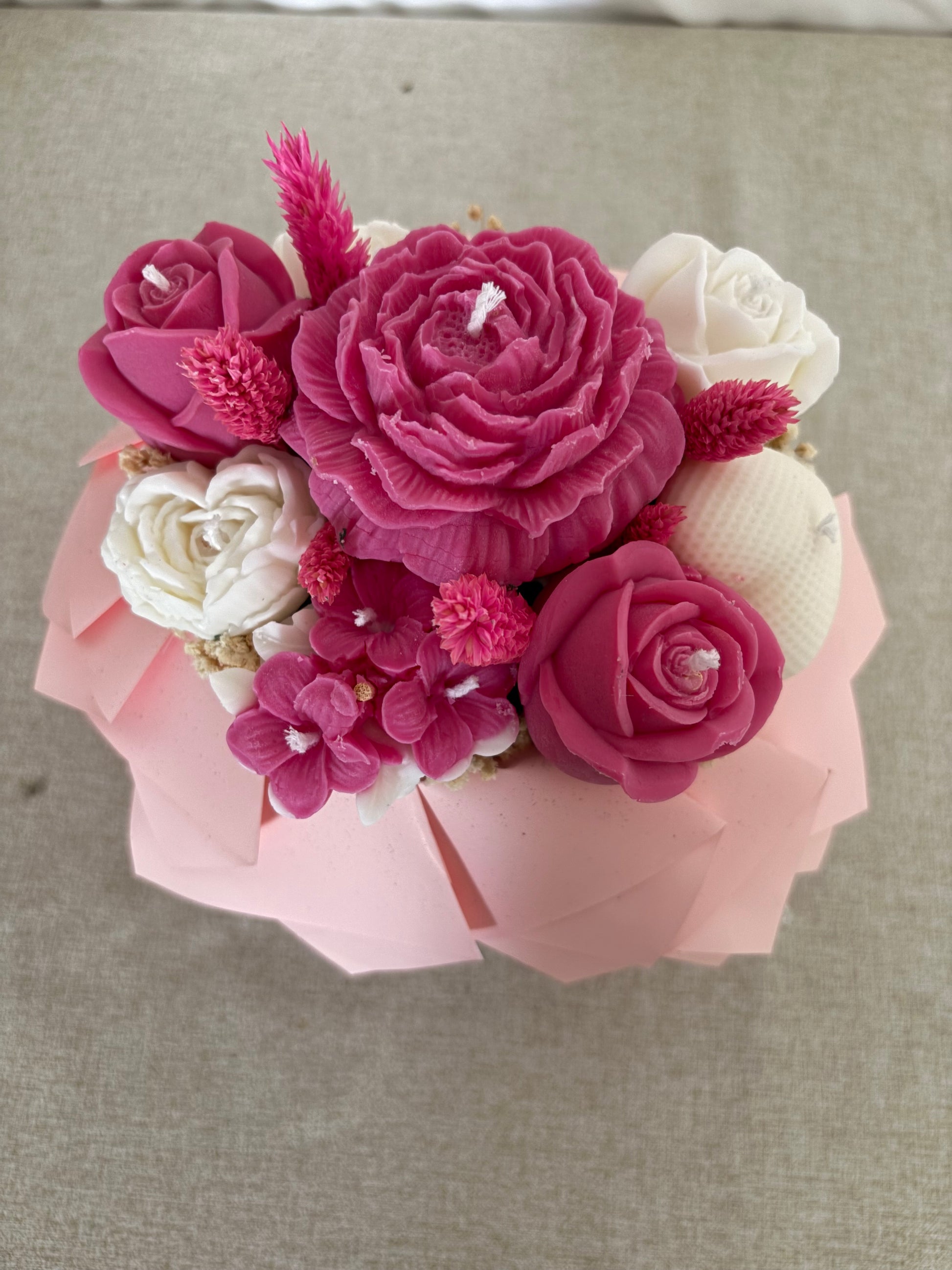 ✨ Cette composition florale réunit pivoines, roses, frangipaniers et un cœur, minutieusement façonnés en cire végétale et enrichis d’une fragrance de Grasse.