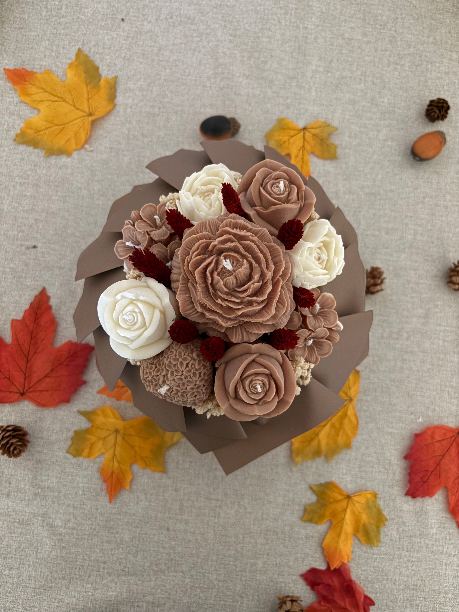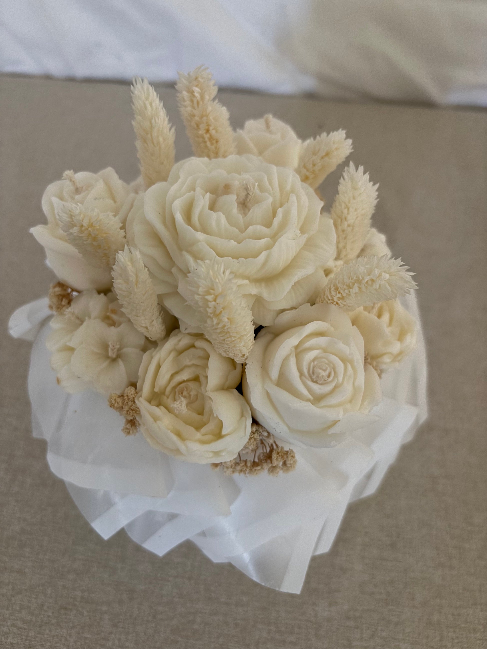 ✨ Cette composition florale réunit pivoines, roses, frangipaniers et un petit cœur, minutieusement façonnés en cire végétale et enrichis d’une fragrance de Grasse.