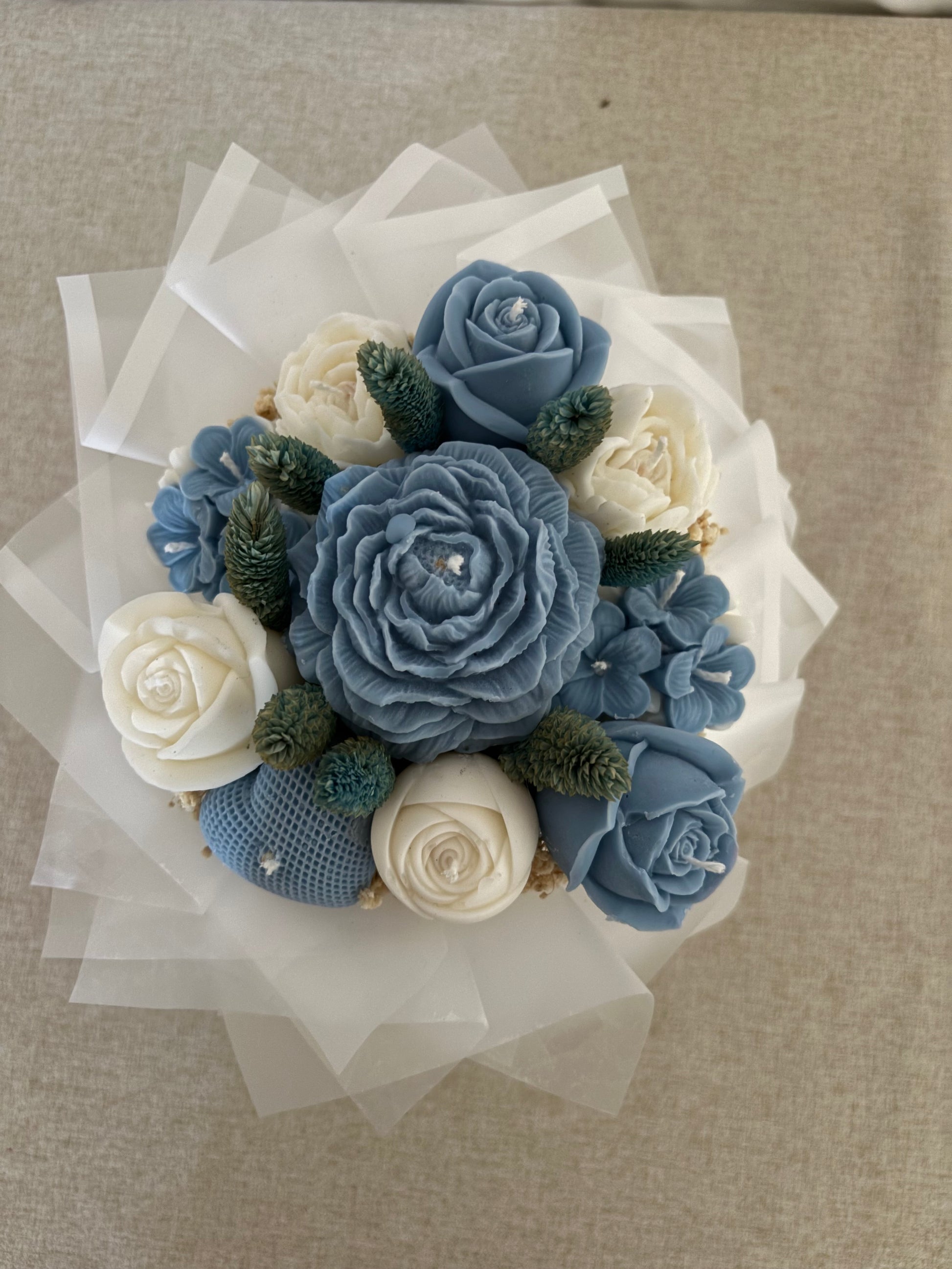 ✨ Cette composition florale réunit pivoines, roses, frangipaniers et un cœur, minutieusement façonnés en cire végétale et enrichis d’une fragrance de Grasse.
