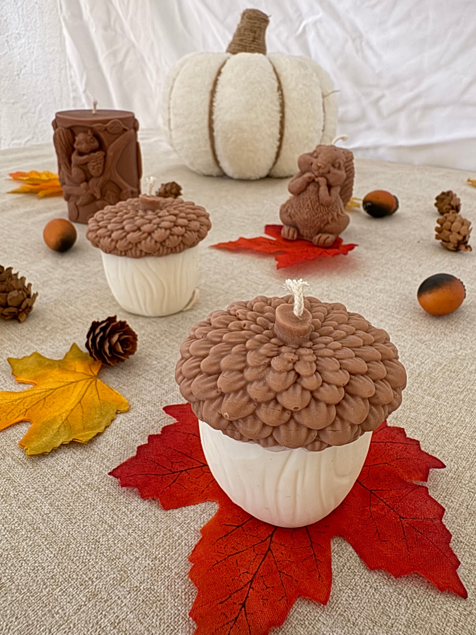 ✨ Inspirée des forêts d’automne, cette bougie en forme de gland imite parfaitement cet élément naturel grâce à sa texture et sa silhouette.
