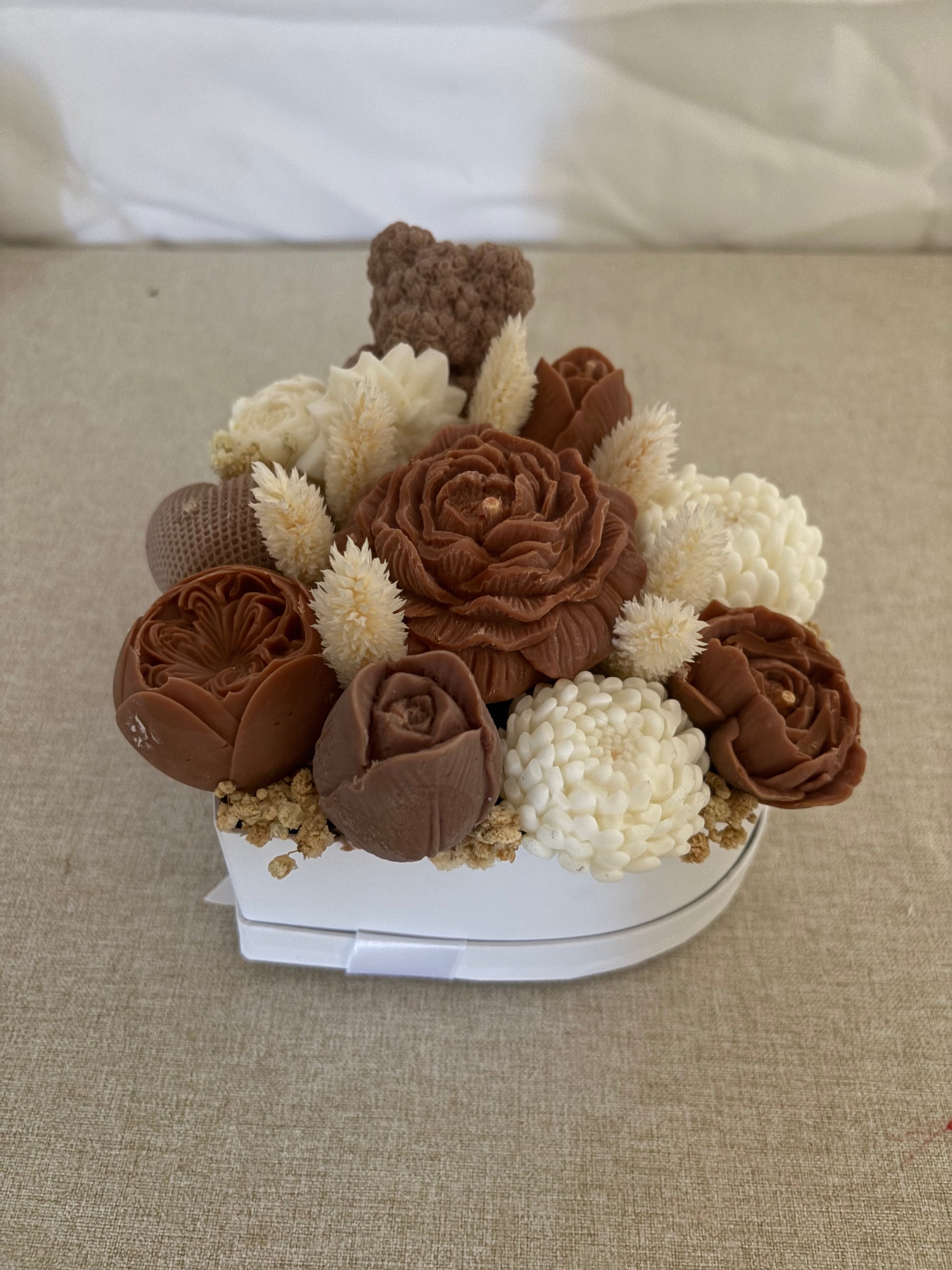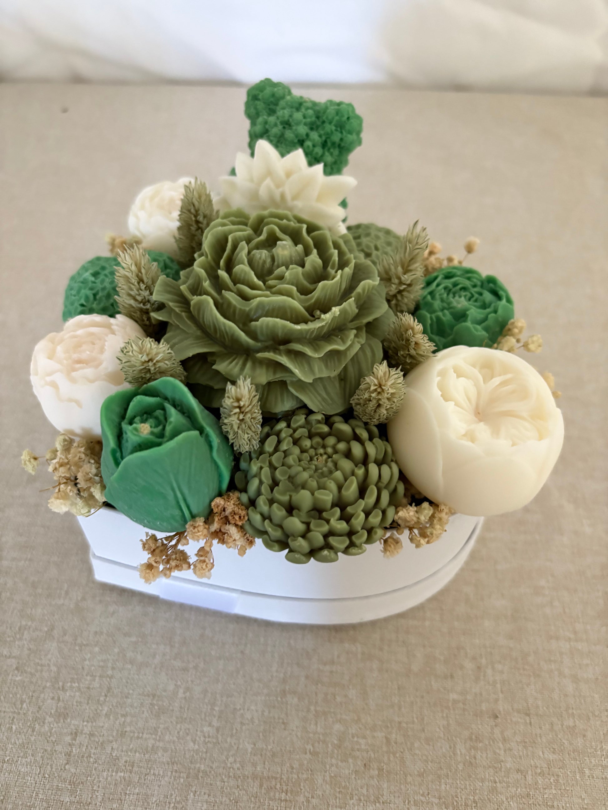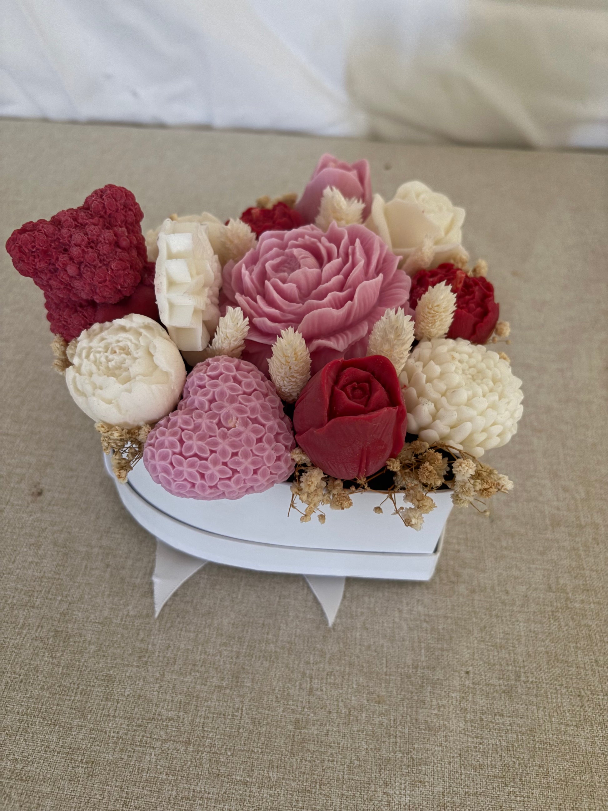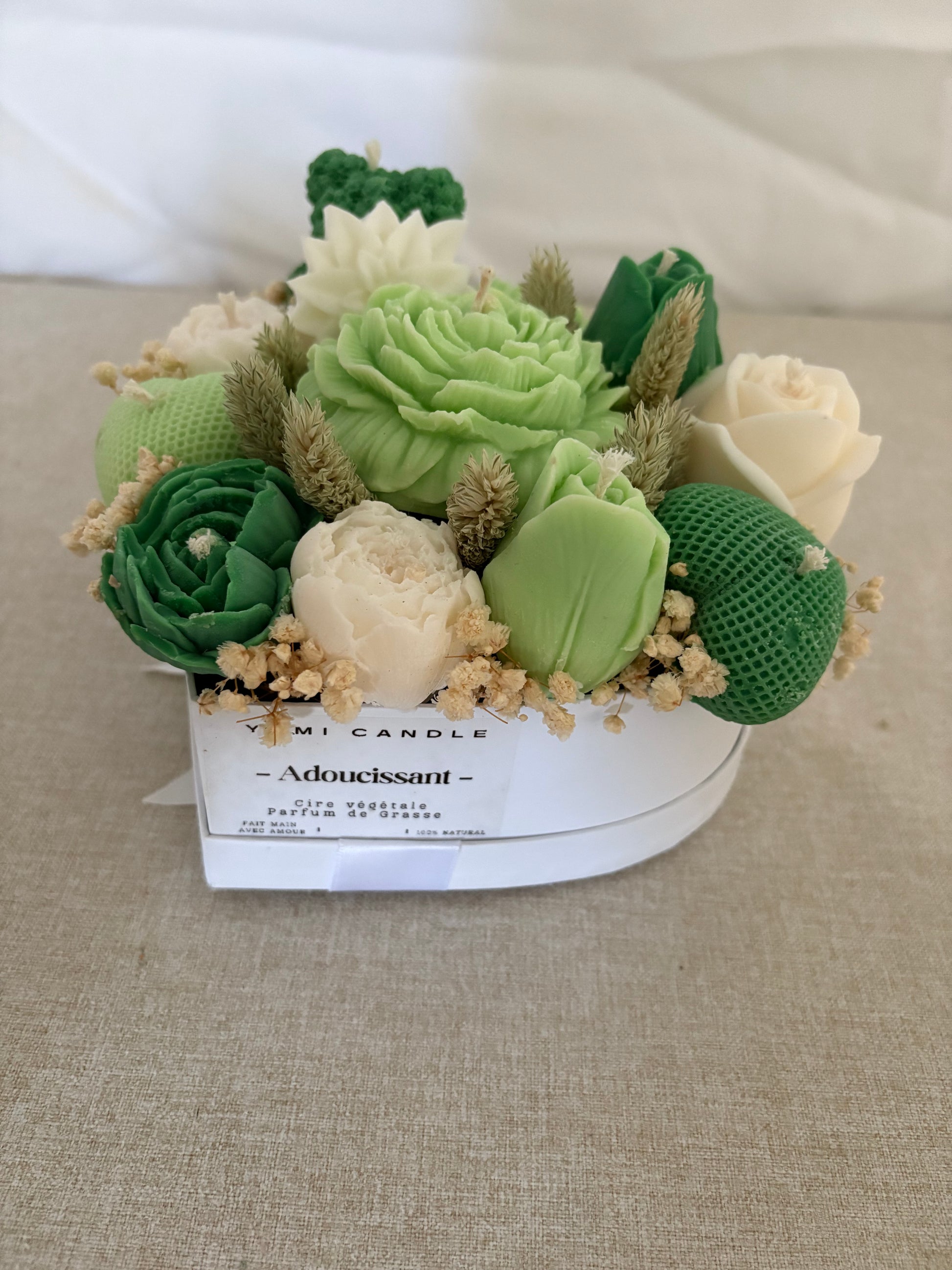 ✨ Cette composition florale réunit un joli panaché de fleurs et un ourson, minutieusement façonnés en cire végétale et enrichis d’une fragrance de Grasse.