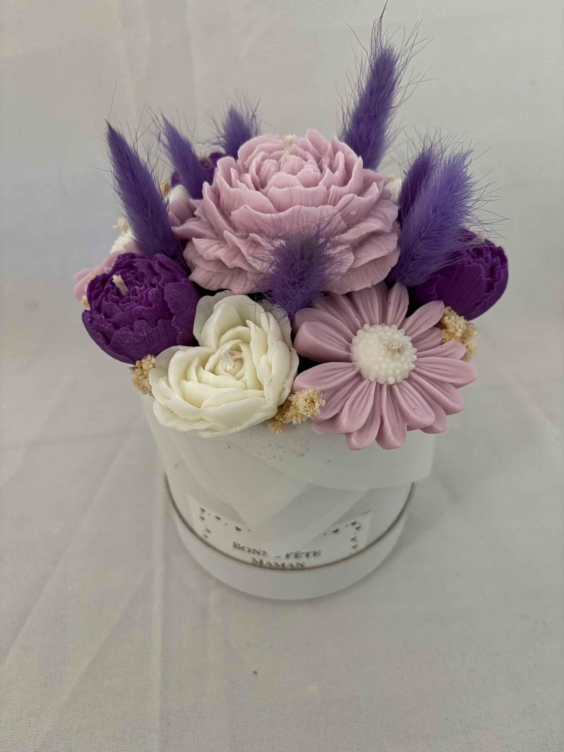 ✨ Cette composition florale réunit pivoines, roses et marguerites, minutieusement façonnés en cire végétale et enrichis d’une fragrance de Grasse.
