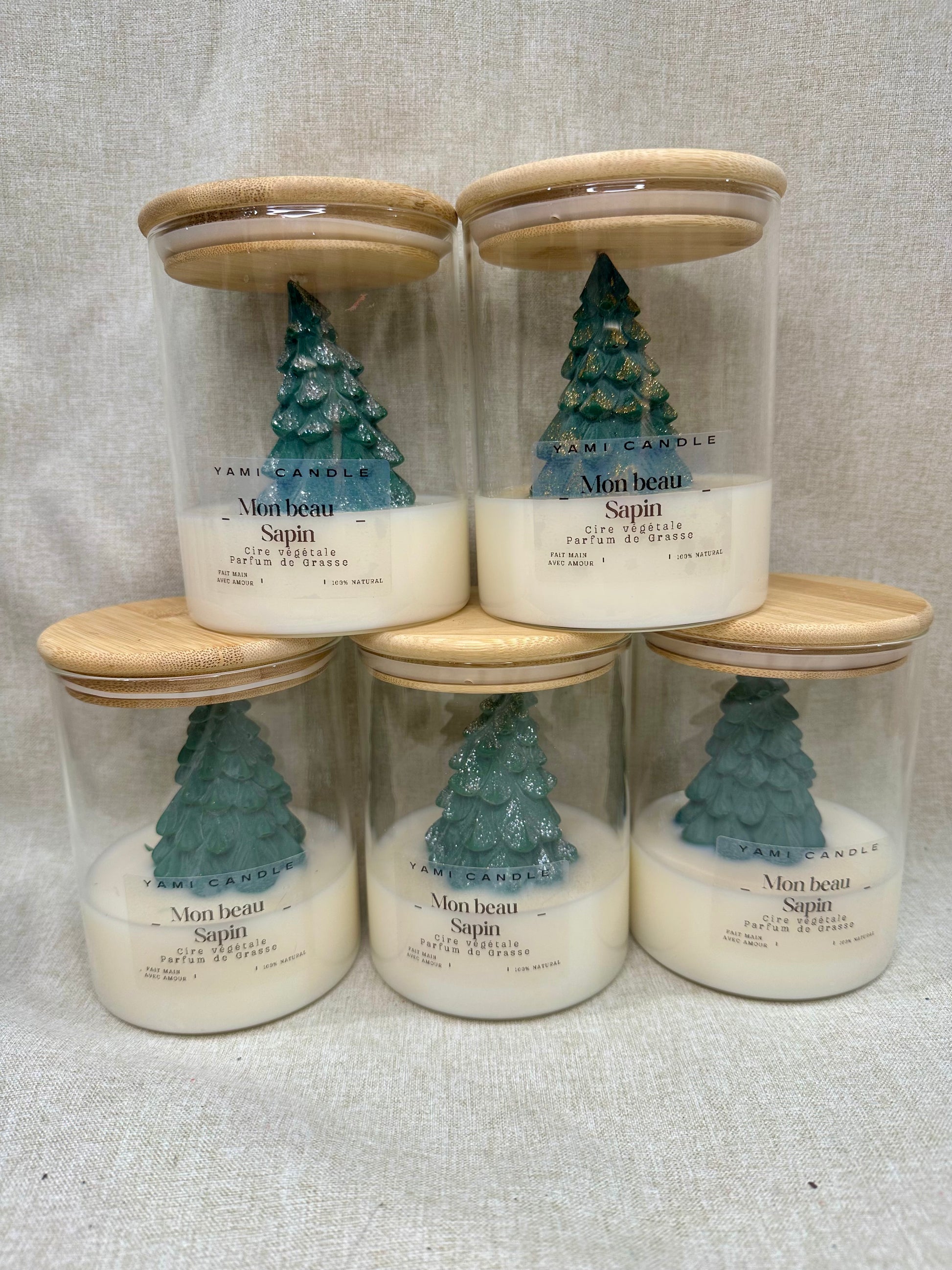 ✨Présentée dans un élégant pot en verre, cette création renferme un sapin de Noël pailleté en cire parfumée, aussi décoratif que féerique.
