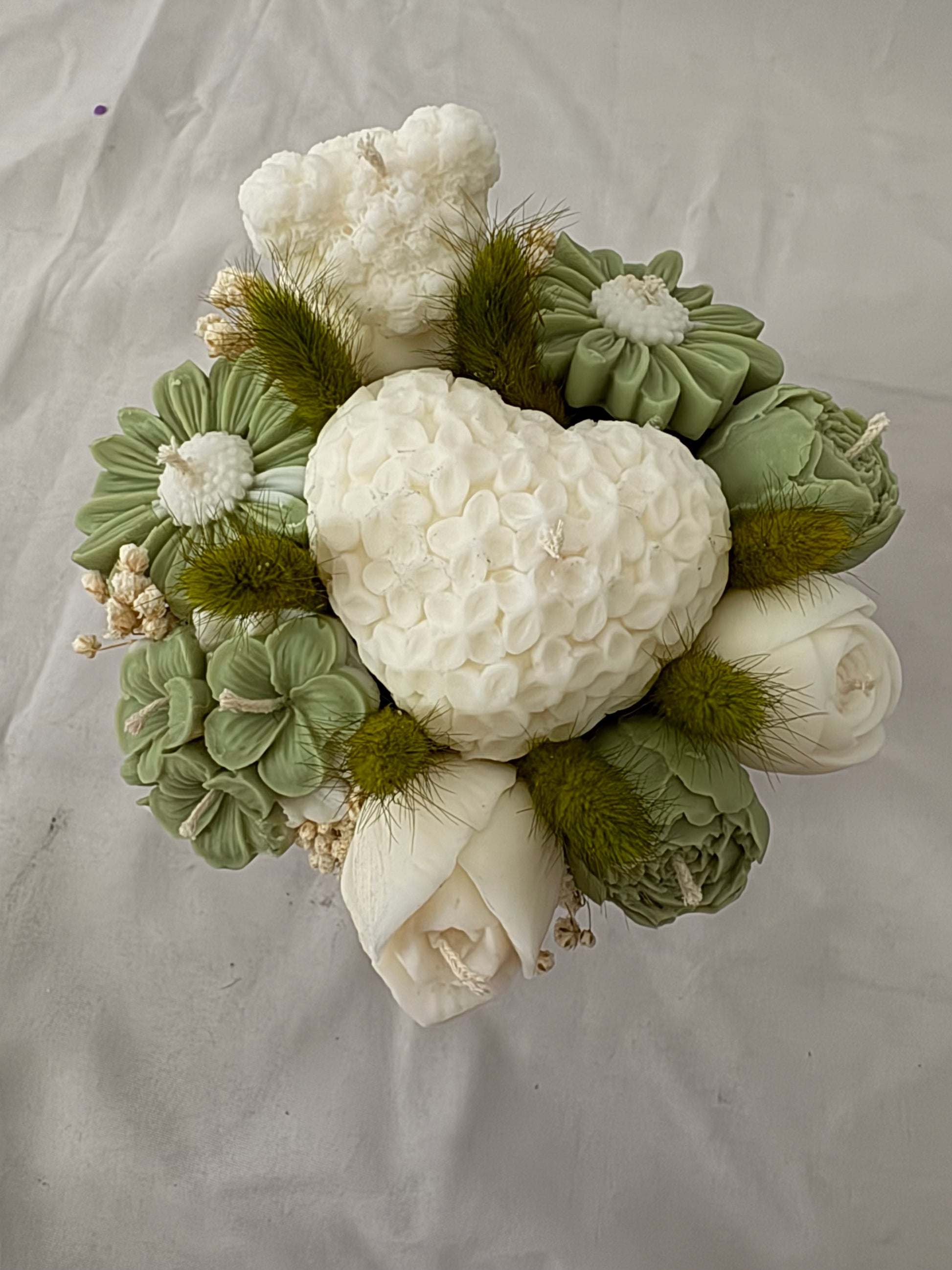 ✨ Cette composition florale réunit roses, pivoines, marguerites, ourson et un gros cœur, minutieusement façonnés en cire végétale et enrichis d’une fragrance de Grasse.