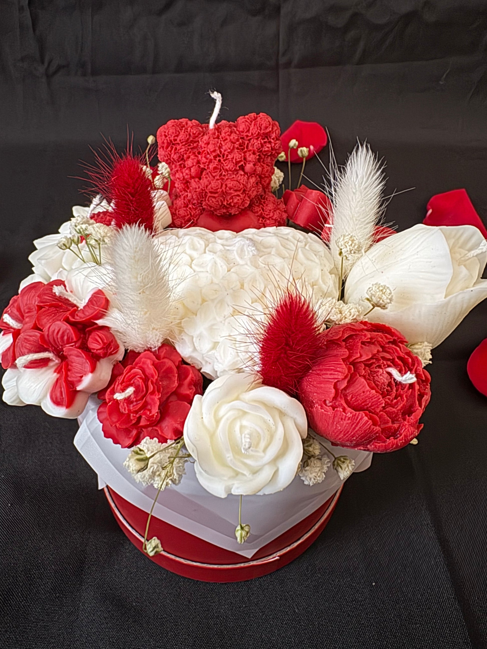 ✨ Cette composition florale réunit roses, pivoines, marguerites, ourson et un gros cœur, minutieusement façonnés en cire végétale et enrichis d’une fragrance de Grasse.