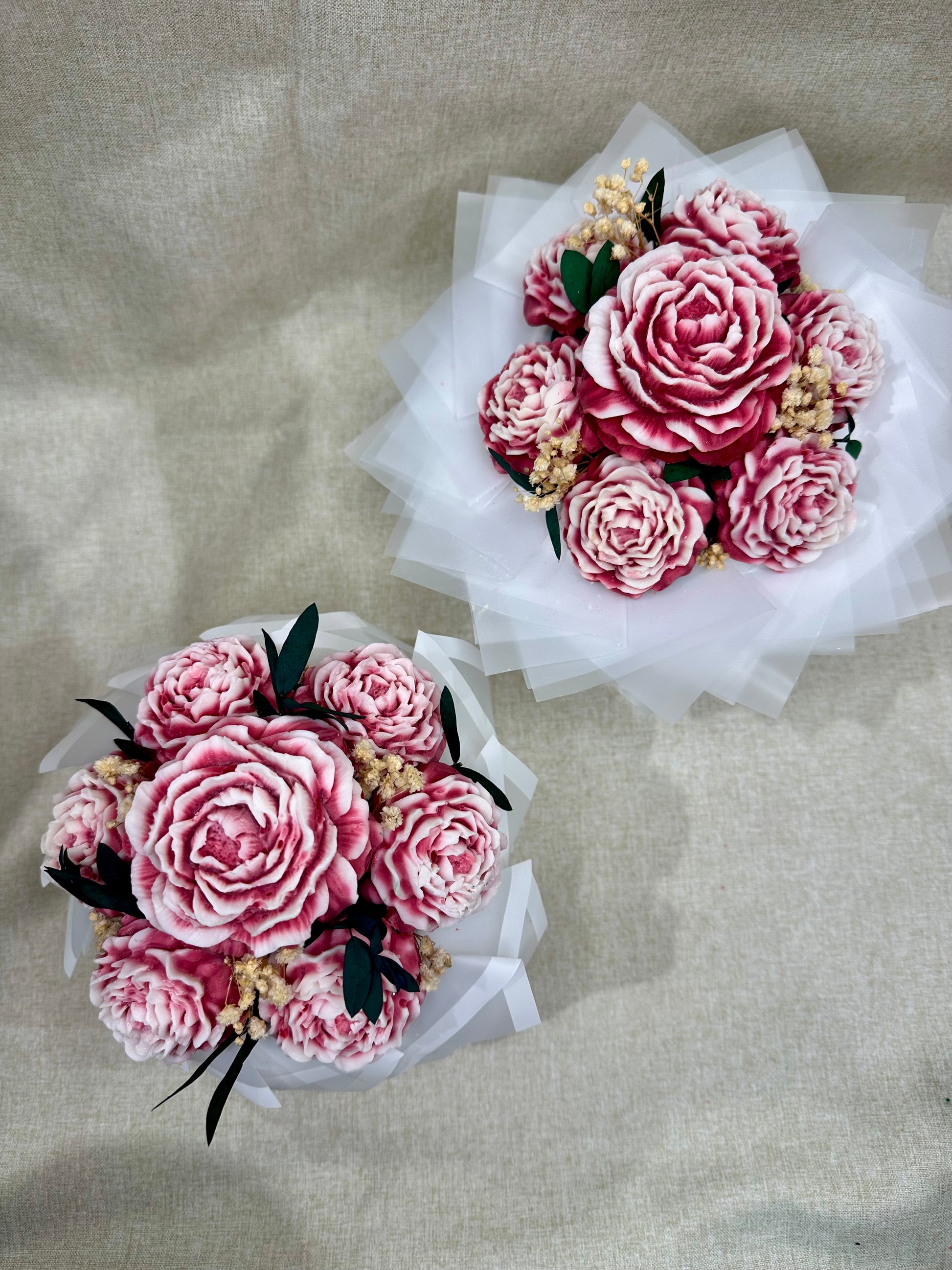 ✨ Cette composition florale réunit des pivoines, minutieusement façonnées en cire végétale et enrichies d’une fragrance de Grasse.