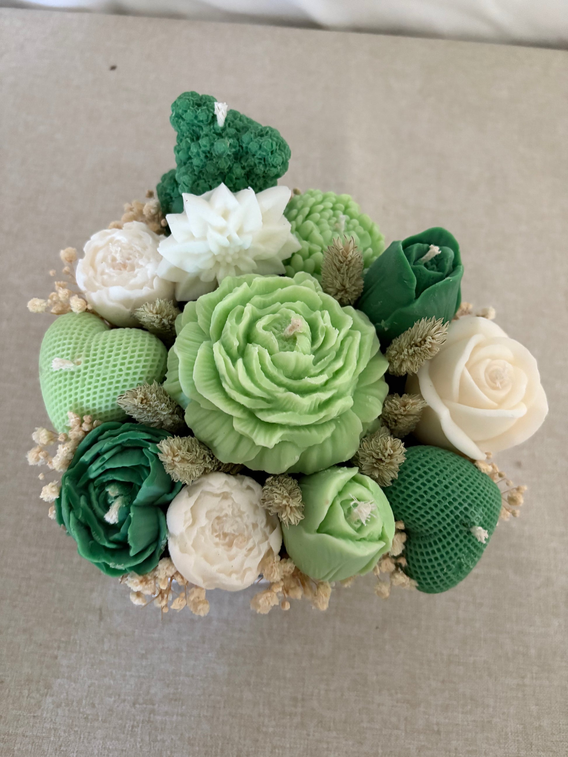 ✨ Cette composition florale réunit un joli panaché de fleurs et un ourson, minutieusement façonnés en cire végétale et enrichis d’une fragrance de Grasse.