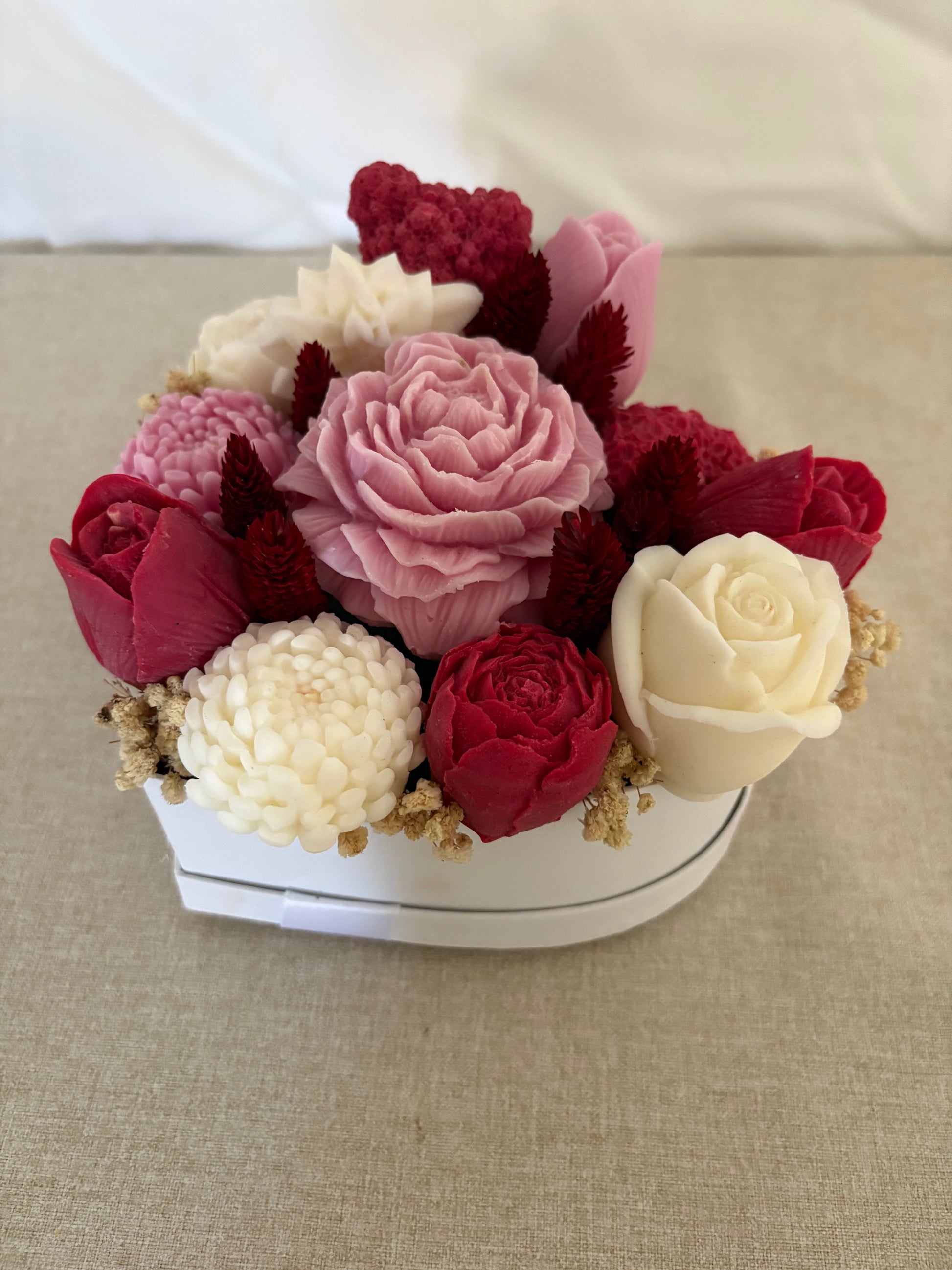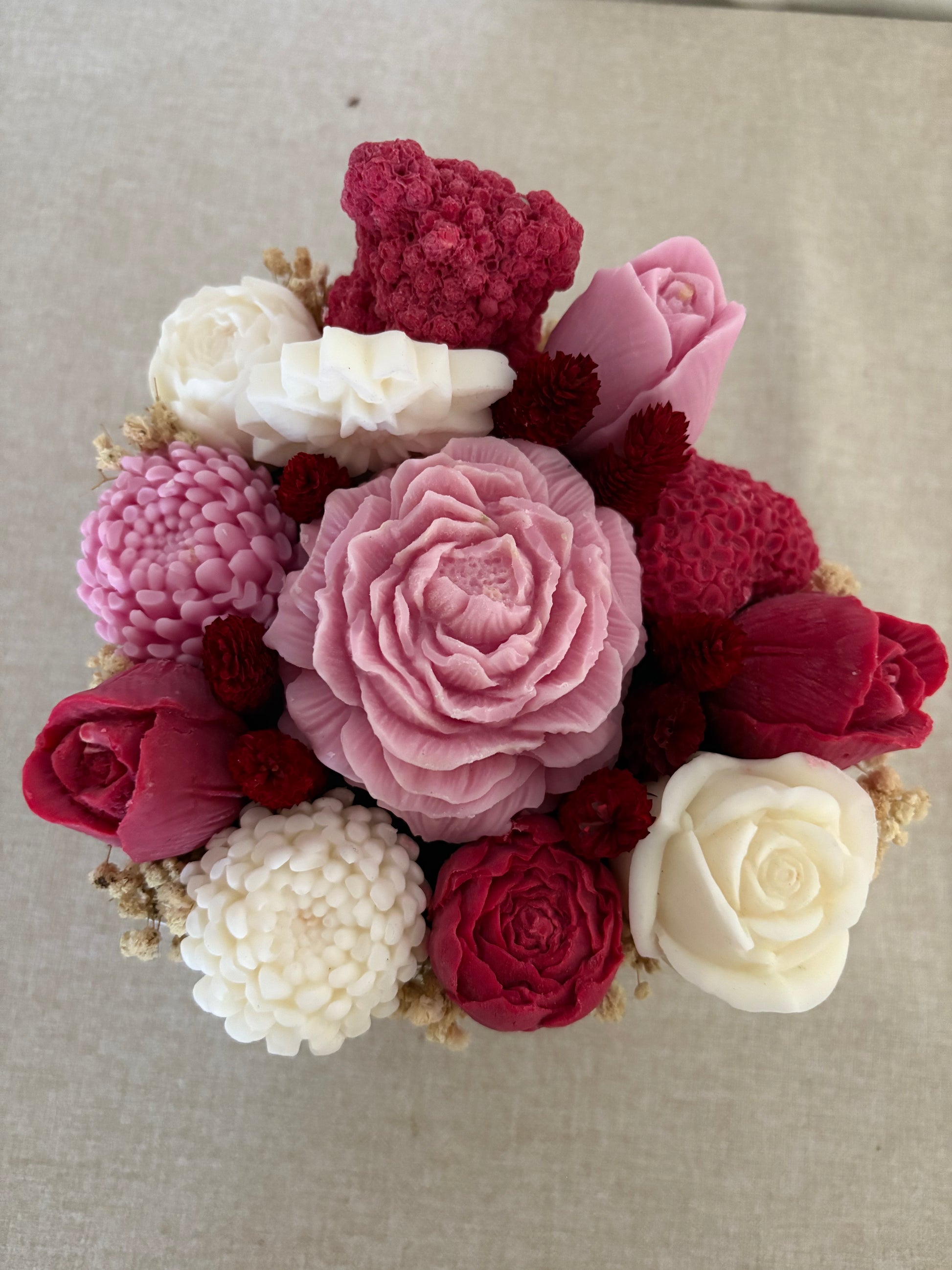 ✨ Cette composition florale réunit un joli panaché de fleurs et un ourson, minutieusement façonnés en cire végétale et enrichis d’une fragrance de Grasse.