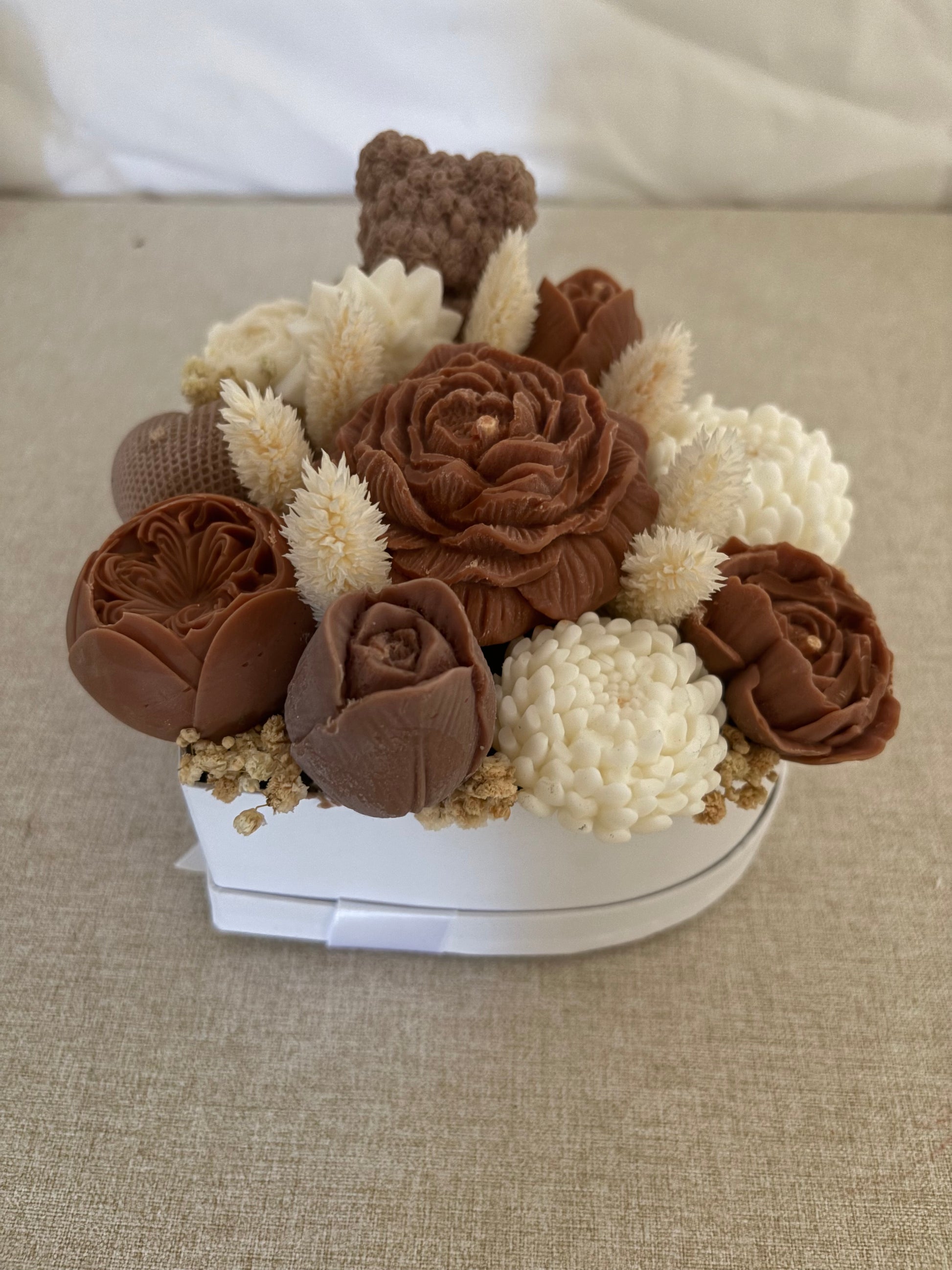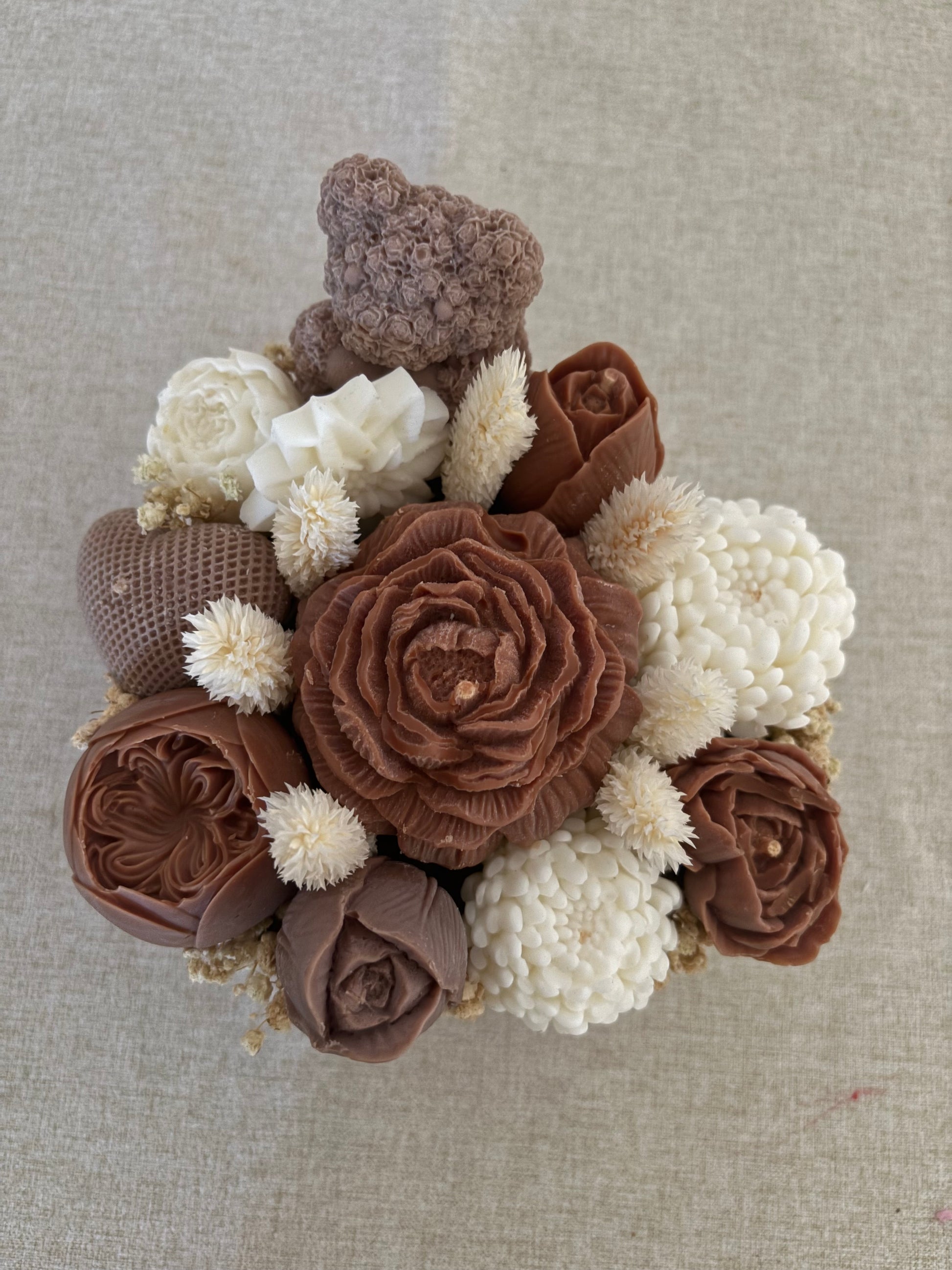 ✨ Cette composition florale réunit un joli panaché de fleurs et un ourson, minutieusement façonnés en cire végétale et enrichis d’une fragrance de Grasse.