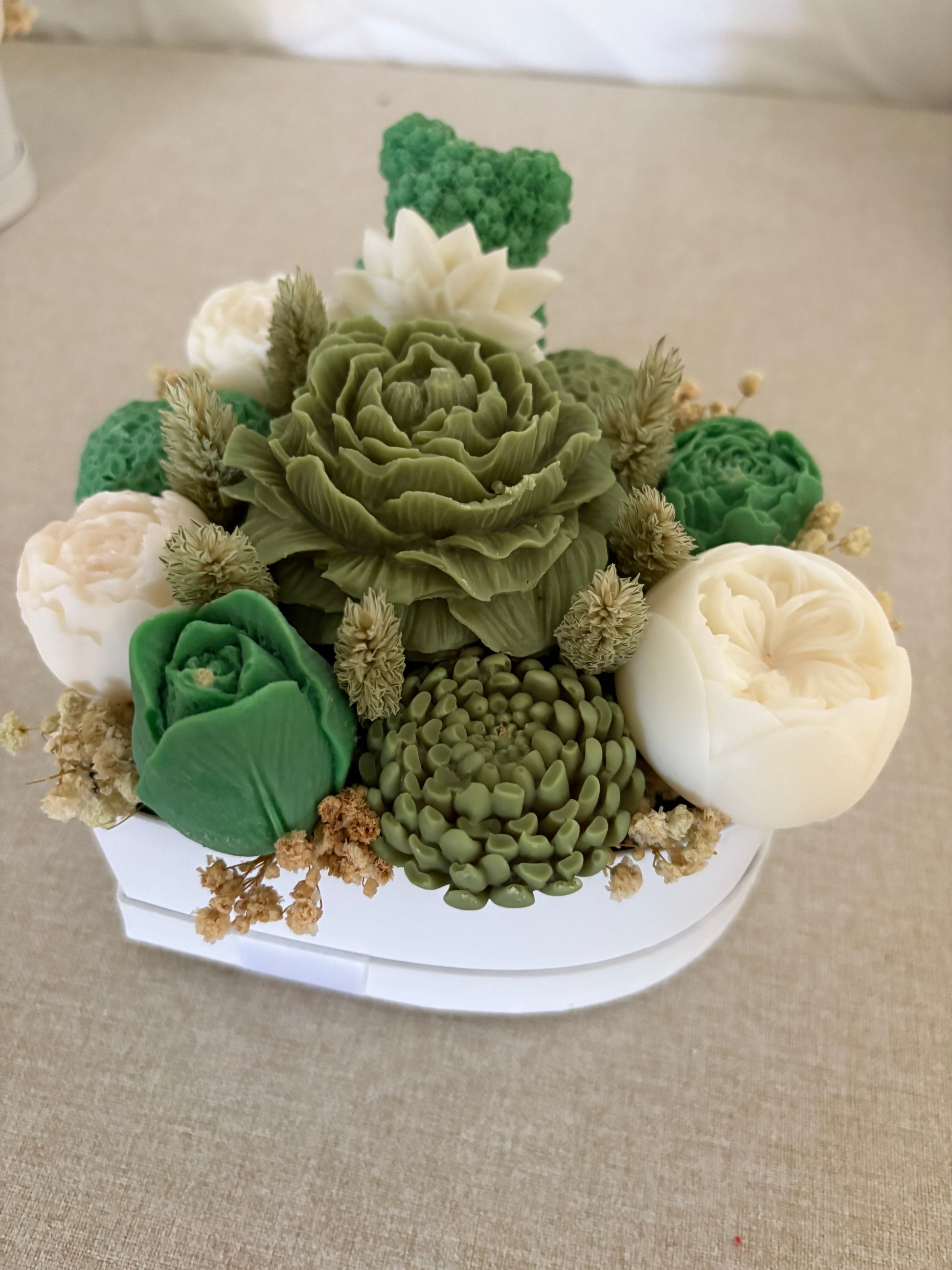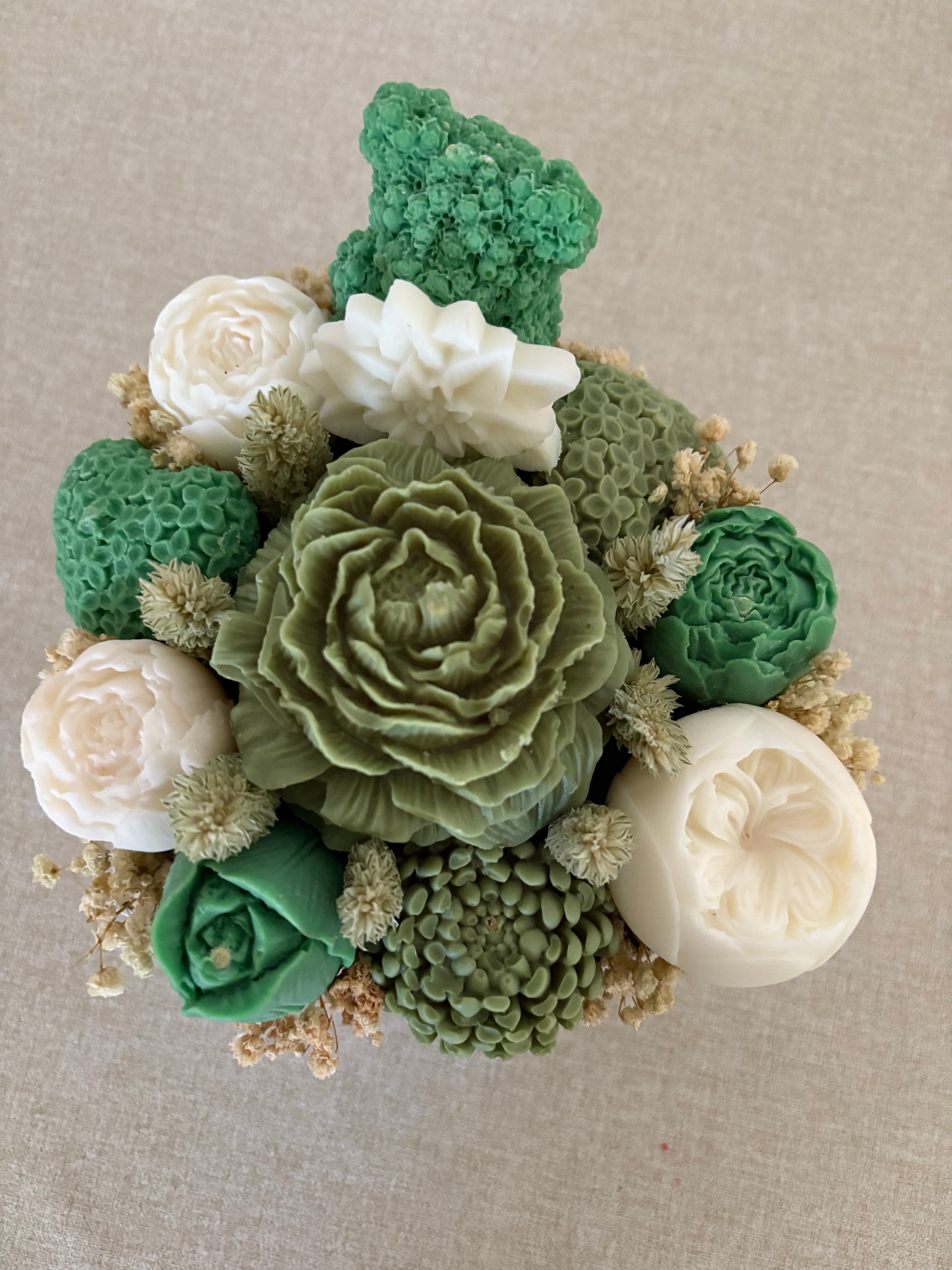 ✨ Cette composition florale réunit un joli panaché de fleurs et un ourson, minutieusement façonnés en cire végétale et enrichis d’une fragrance de Grasse.