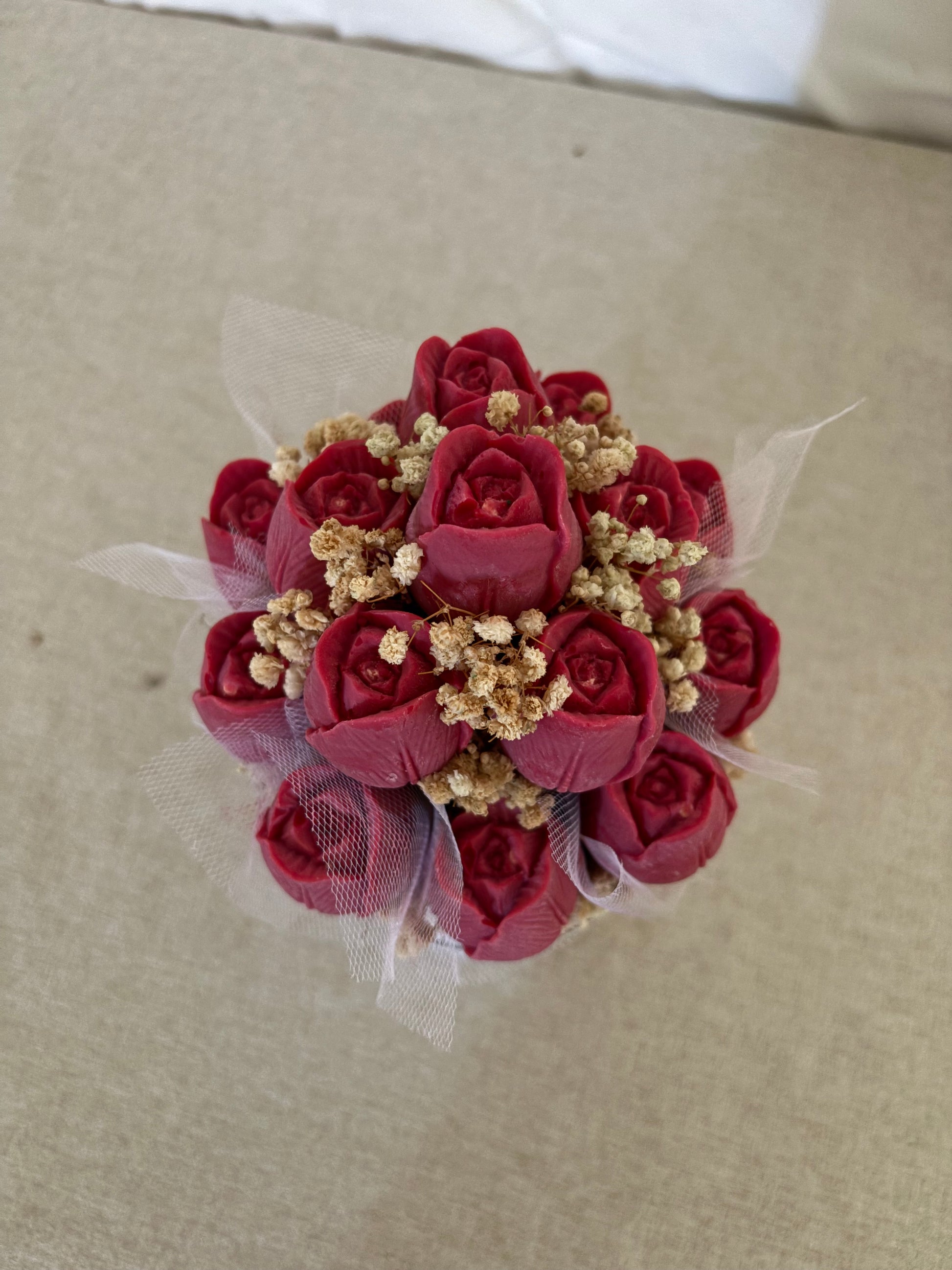 ✨ Cette composition florale réunit des tulipes teintées de bordeaux, minutieusement façonnées en cire végétale et enrichies d’une fragrance de Grasse. ✨